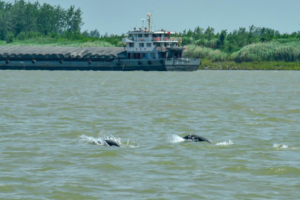 2025年5月19日,安徽省铜陵淡水豚国家级自然保护区内,三头江豚一起浮出水面换气。(储著传 摄)