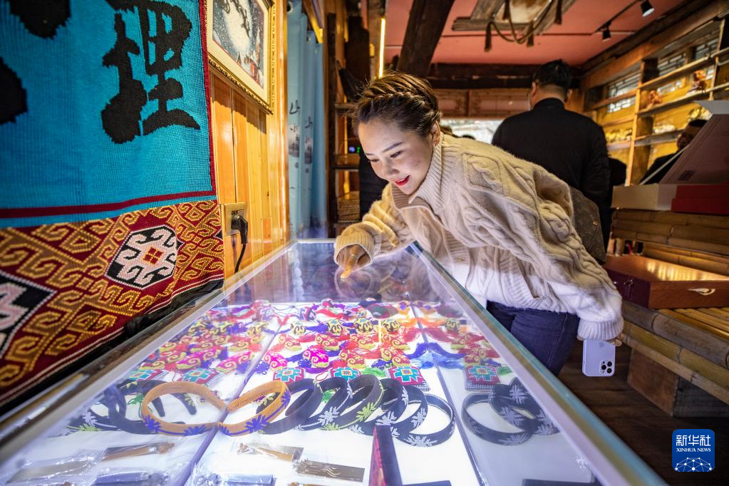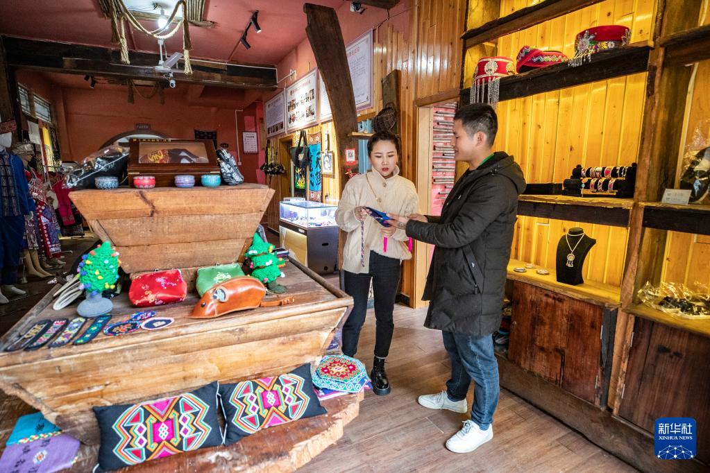 3月22日,在重庆市黔江区小南海镇新建村,游客在西兰卡普文创产品展示中心挑选产品。新华社记者 黄伟 摄