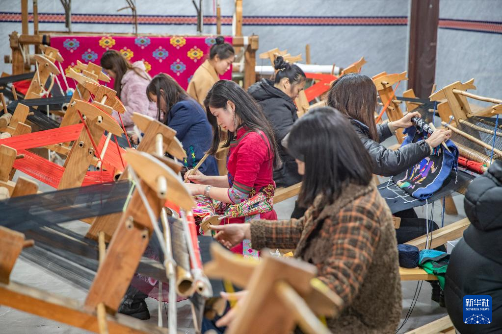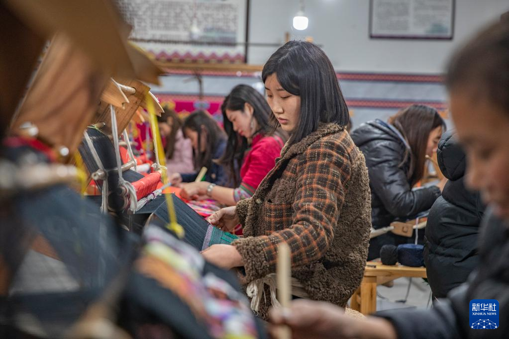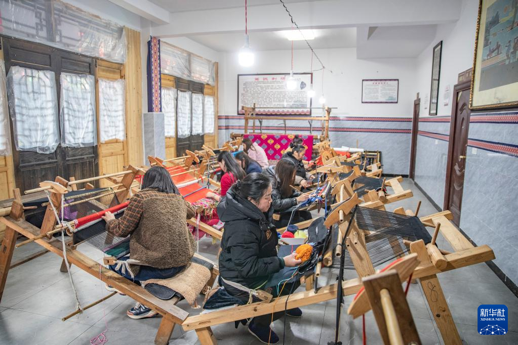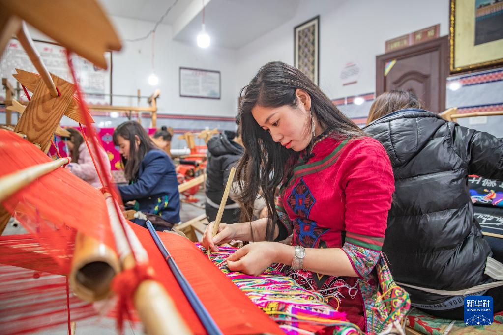 3月22日,在重庆市黔江区小南海镇新建村的西兰卡普非遗工坊,村民在编织西兰卡普产品。新华社记者 黄伟 摄
