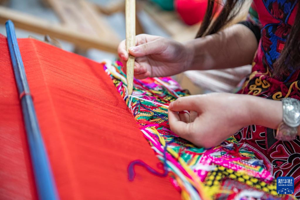 3月22日,在重庆市黔江区小南海镇新建村西兰卡普非遗工坊,村民在编织西兰卡普产品。新华社记者 黄伟 摄
