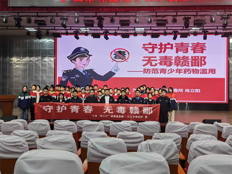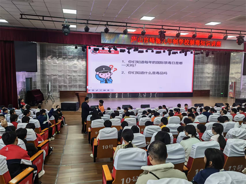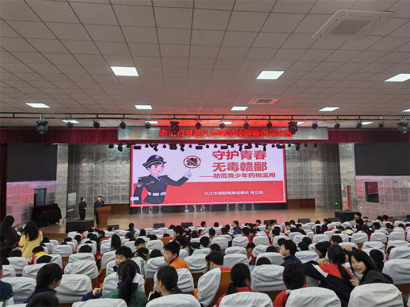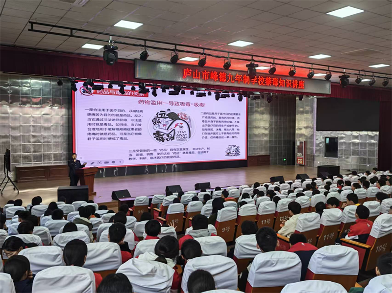为强化青少年禁毒防范意识,筑牢校园禁毒安全防线,深化“无毒赣鄱”建设行动,近日,九江市强制隔离戒毒所教育矫治大队民警一行走进庐山市峰德九年制学校,开展预防青少年药物滥用及禁毒知识专题讲座,为学校师生普及识毒、防毒、拒毒法律知识。学校党支部副书记董翔主持活动,肖立阳警官作专题讲座,学校七年级师生370余人参加。