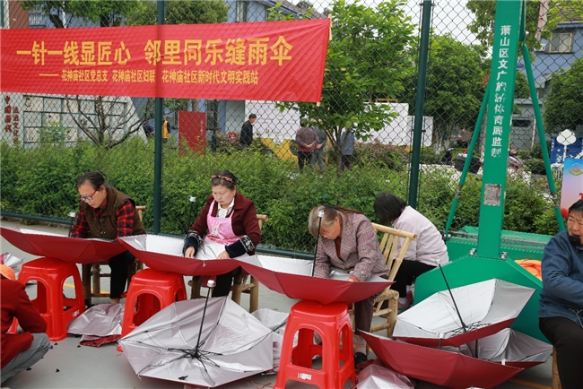 一针一线显匠心,邻里同乐缝雨伞:匠心手工区里,手工老师现场授课,指导居民缝制雨伞,邻里之间互帮互助、分享技巧,拉近了彼此的距离。
