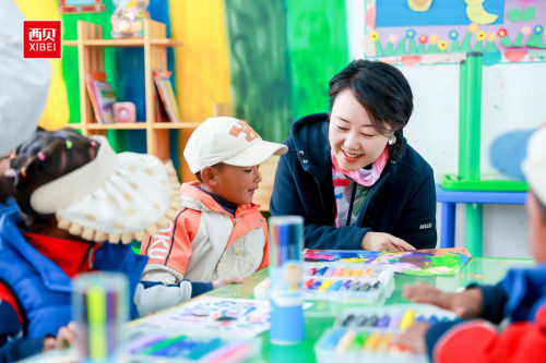 西贝首席贝爱公益官张丽平在西贝捐助的乡村儿童操场项目中与西藏日喀则孩子们一起画画