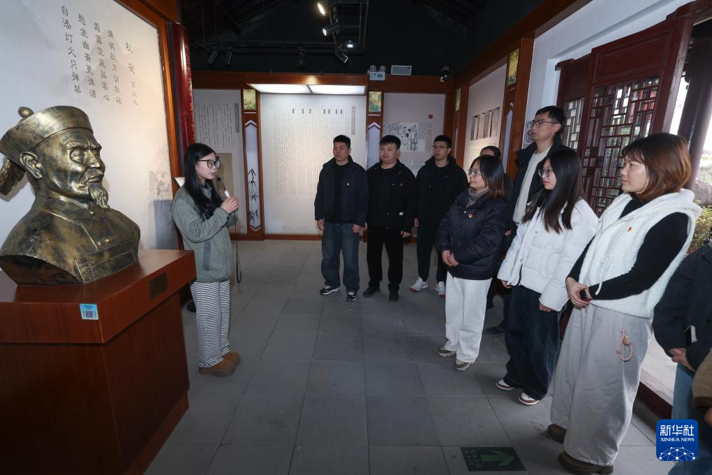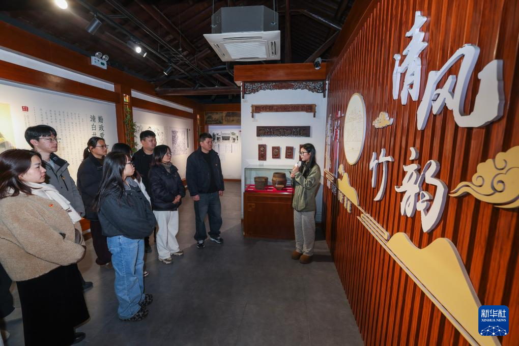 1月28日,在嘉兴市南湖区新丰镇的高以永史料陈列馆内,新丰镇党员干部聆听讲解员阐释“忠孝世泽,清白共守”家风家训。