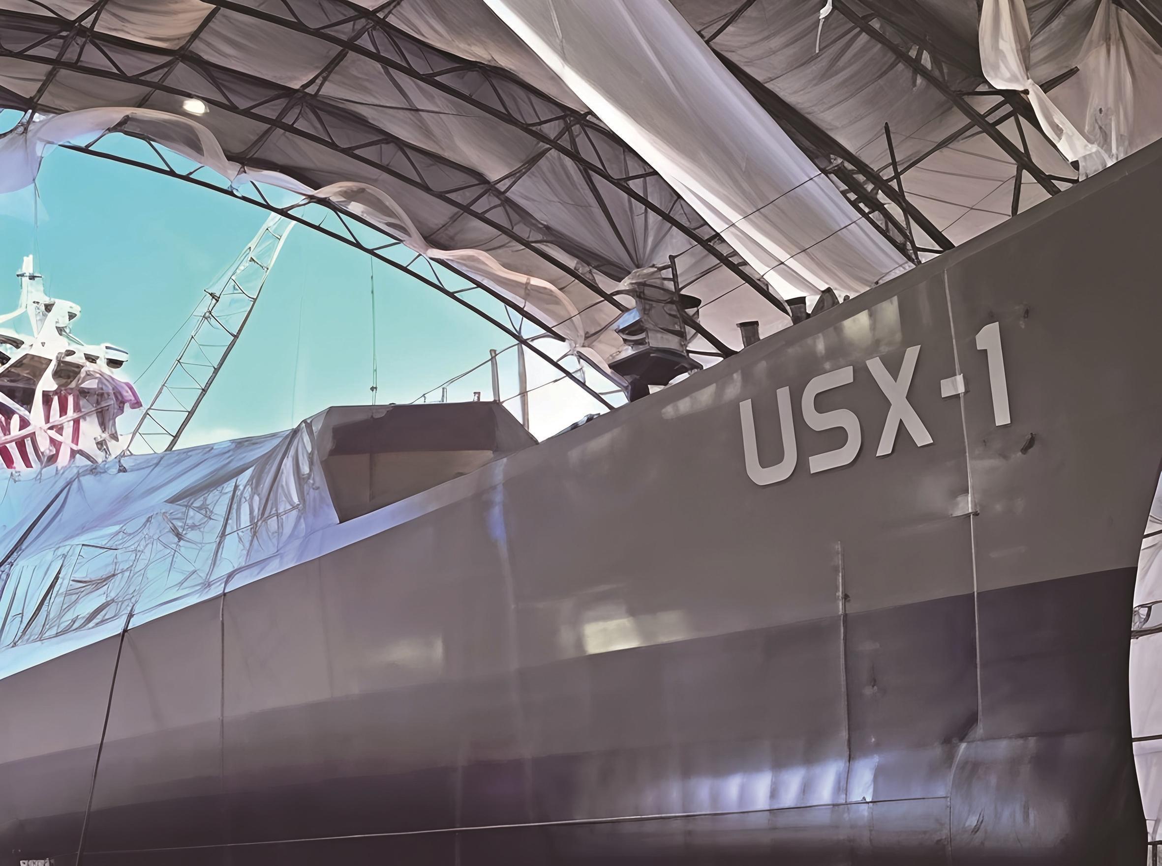 USX-1全长约55米,排水量约240吨,航速15-20节,有效载荷约60吨,可在5级海况下持续执行任务,7级海况下安全航行,海上连续自持能力达1年。该舰以彻底无人化、极致模块化和高生存能力为核心,在总体设计、平台设计和信息系统设计等领域,通过颠覆性的工程创新,实现了传统舰艇难以企及的性能突破。