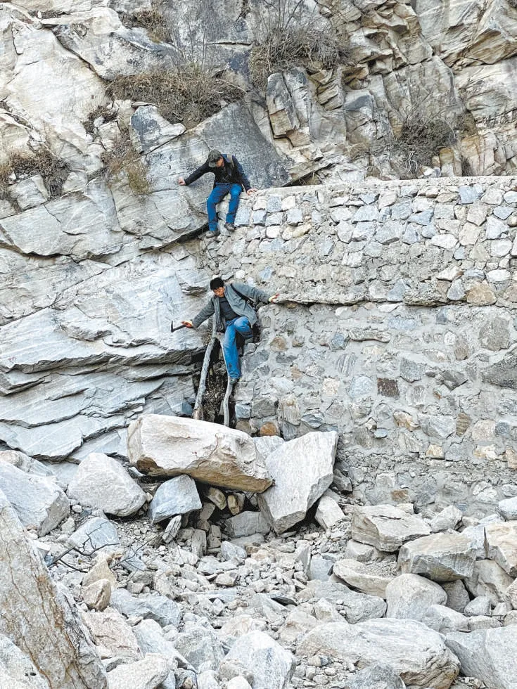 20公里,陡崖交错。山里没有路,只有方向,嶙峋的巨石像沉睡的野兽,横亘在狭窄的山径上;百米高的陡崖下,是深不见底的沟壑。
