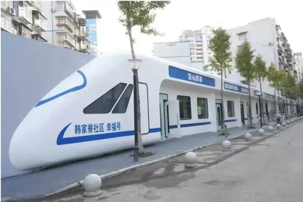 与汉仙桥社区紧邻式的社区综合服务中心不同,游仙区涪江街道韩家脊社区结合自身实际,采用嵌入式改造模式,让便民服务更加“融”入居民生活圈。在社区“幸福里”车站广场,新改造的蓝白色调的“韩家脊社区幸福号”列车焕然一新,爱心超市、家庭医生工作站、爱心食堂等近10个功能区在“车厢”内有序布局,让居民在家门口就能享受到“一站式”便民服务。