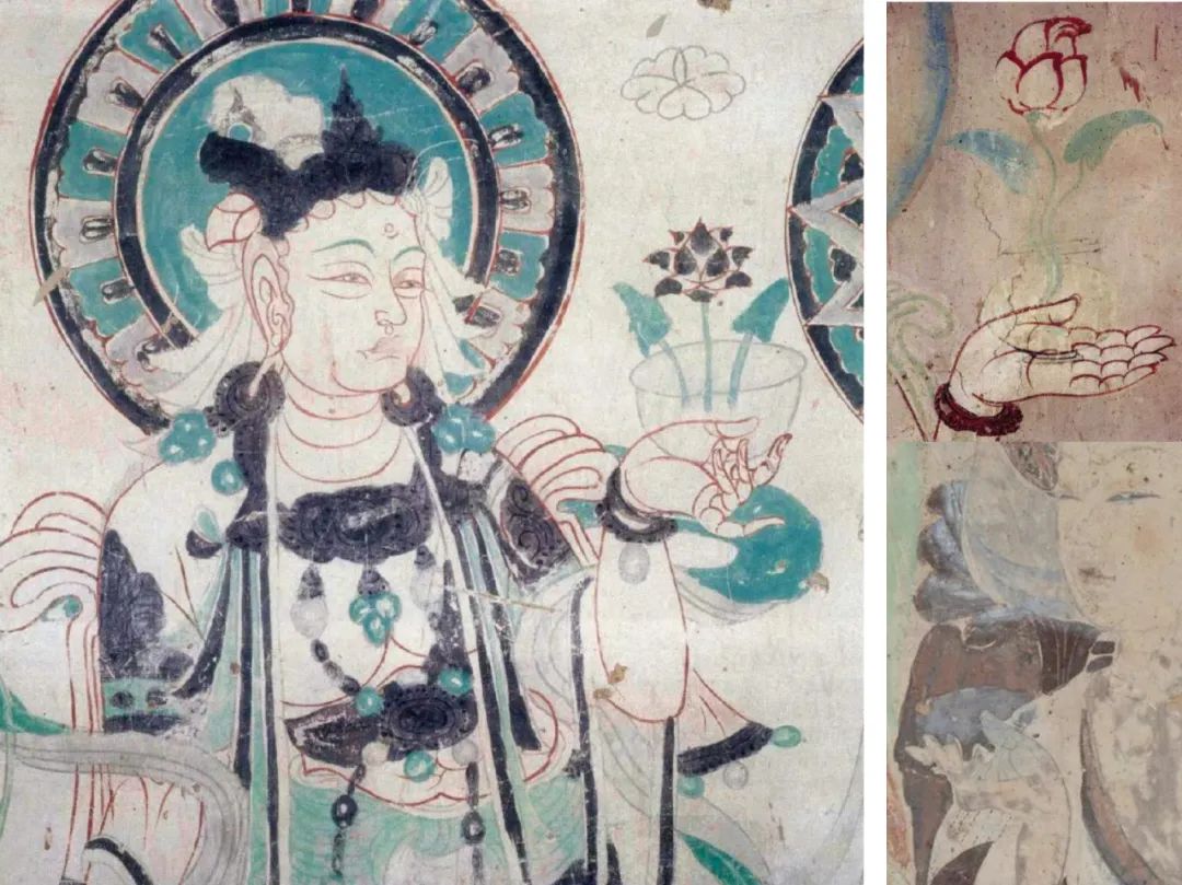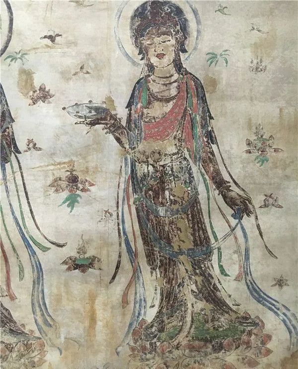 绘制初唐的这幅壁画,虽然斑驳陆离,菩萨面容失色,但晶莹剔透的琉璃盏清晰可辨,十分逼真。