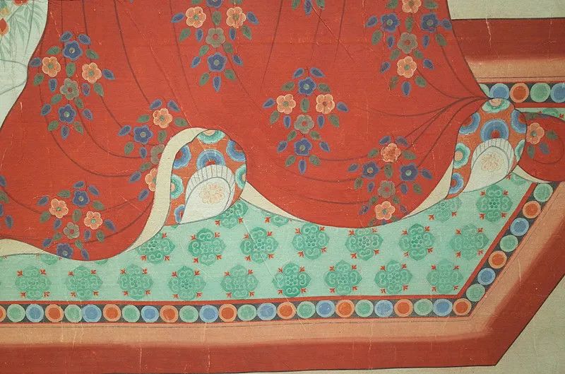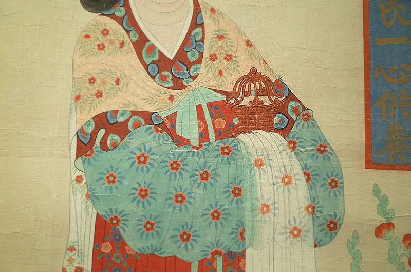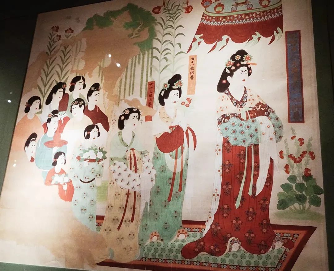原壁画损毁严重,现在看到的这幅是五十年代敦煌研究院院长段文杰临摹的,是莫高窟最庞大宏丽的一幅绮罗人物像